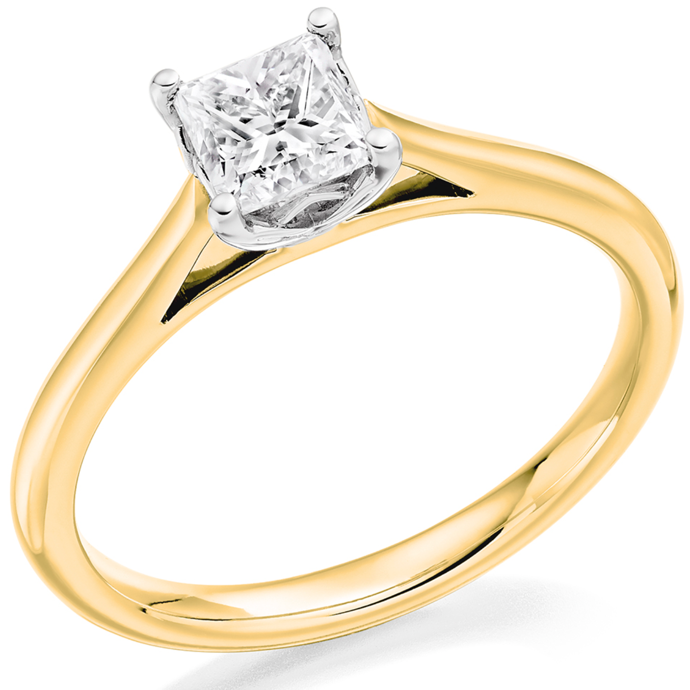 0.50ct Princess cut solitaire single stone engagement ring with plain shoulders. The setting is a 4-claw setting.