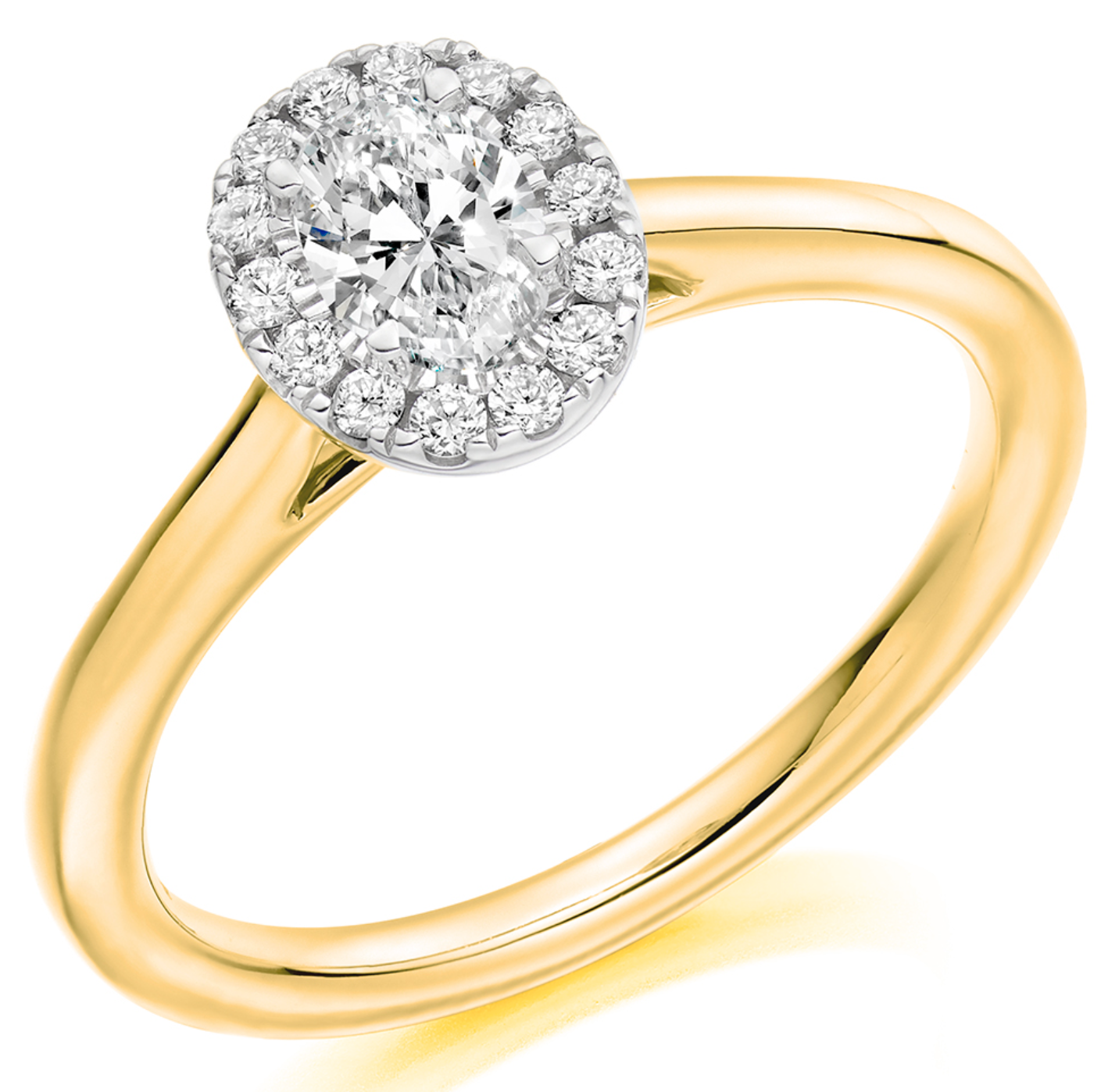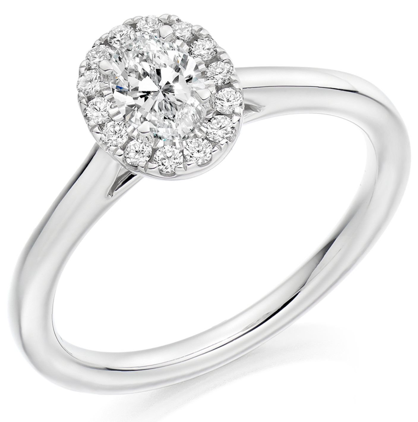 0.65ct total diamond weight Oval cut halo engagement ring with plain shoulders. The setting is claw-set and micro-claw set.