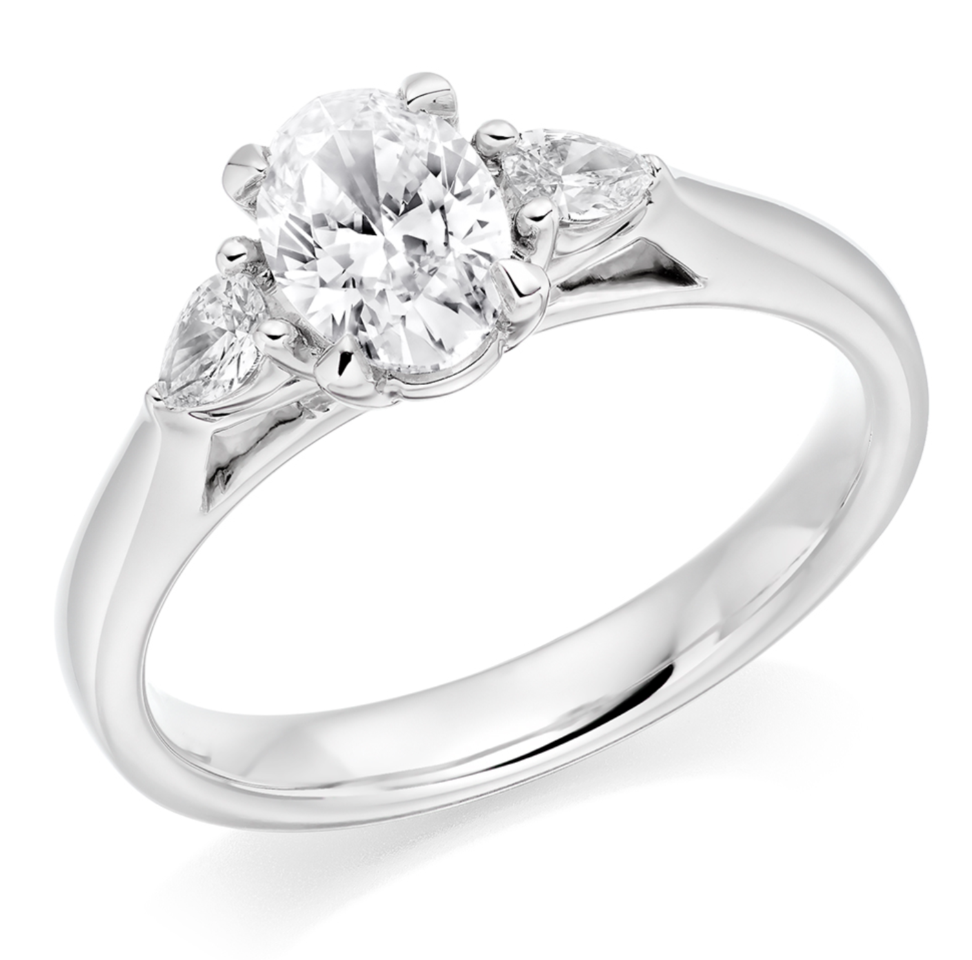 0.70ct total diamond weight Oval and Pear cut trilogy engagement ring with plain shoulders. The setting is claw set.