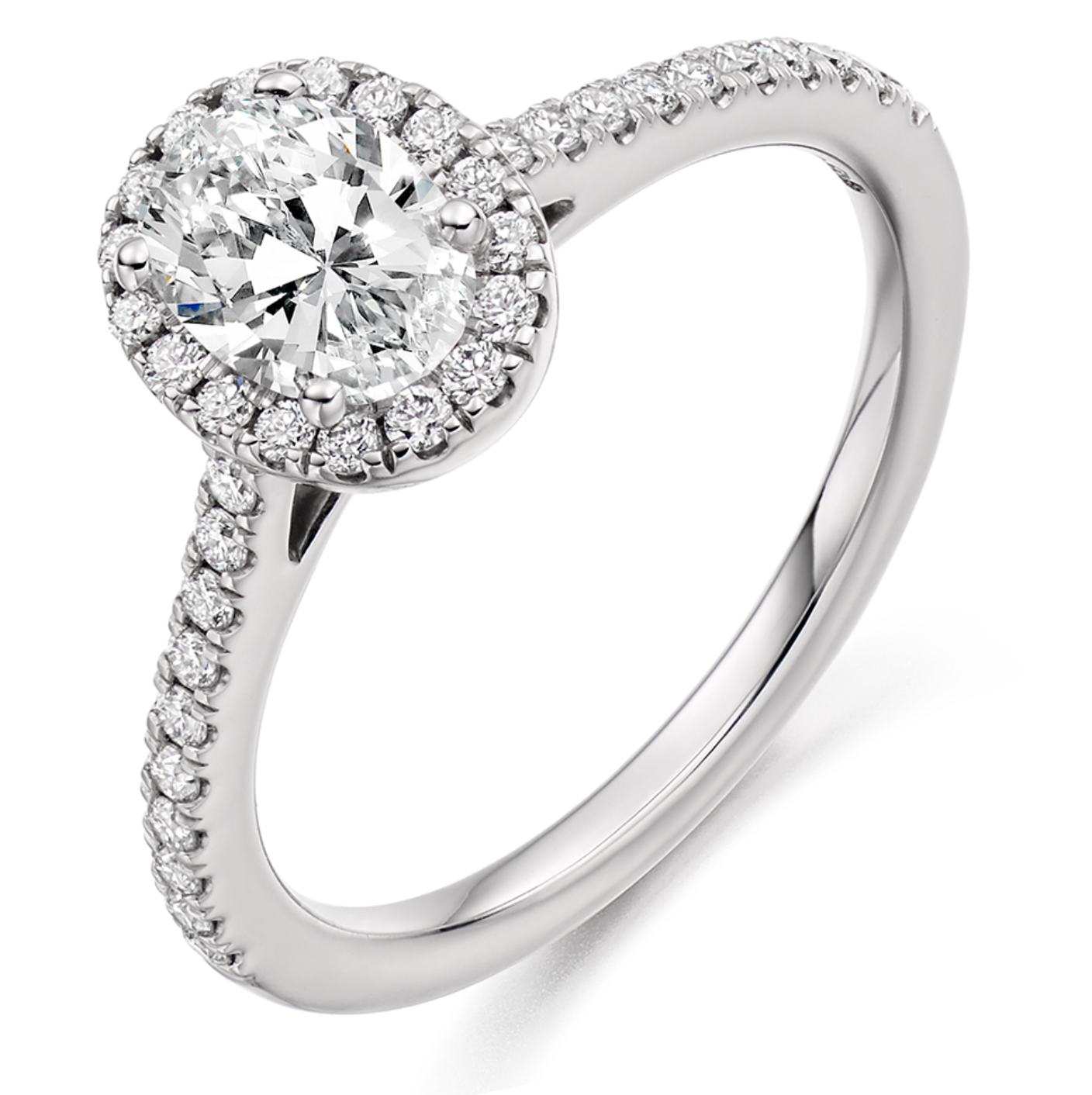 0.85ct total diamond weight Oval cut halo engagement ring with stone-set shoulders. The setting is claw-set and micro-claw set.