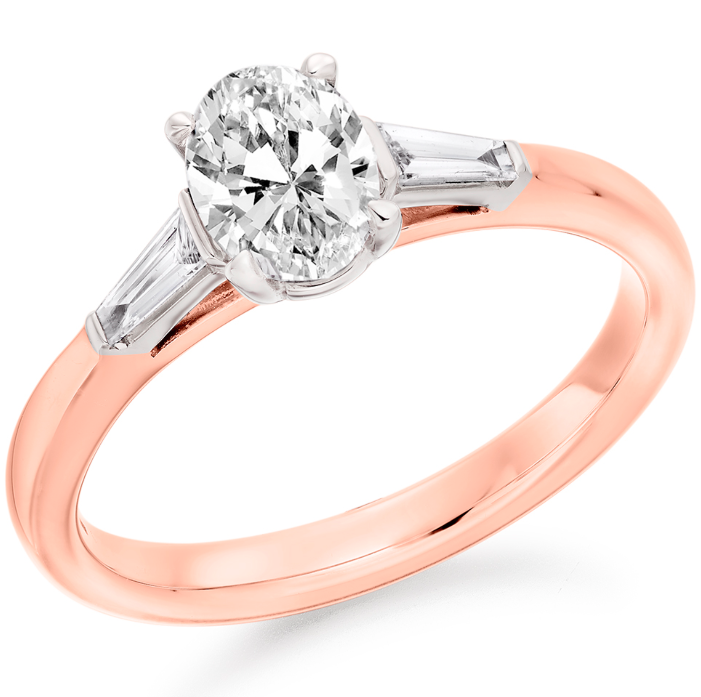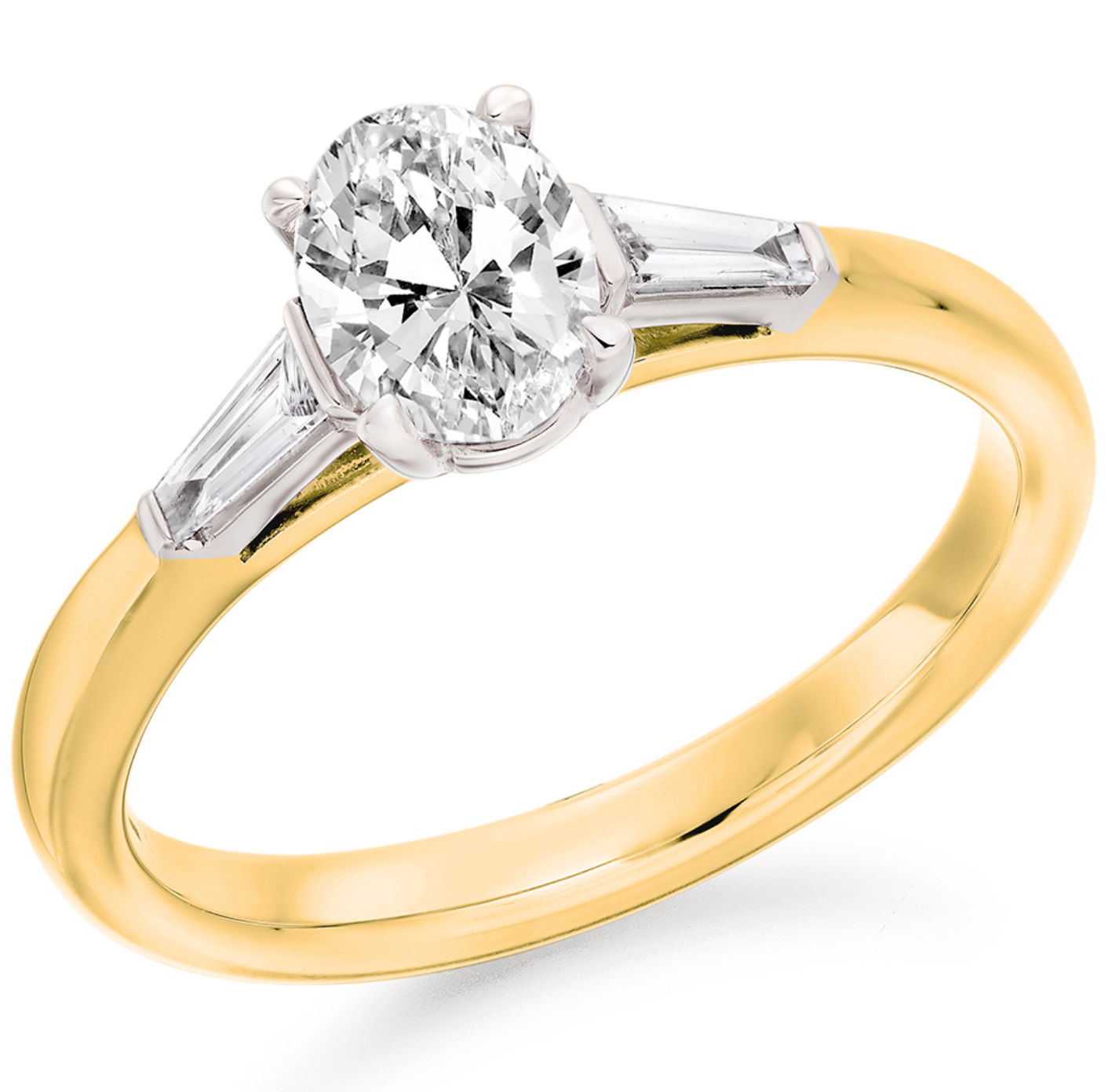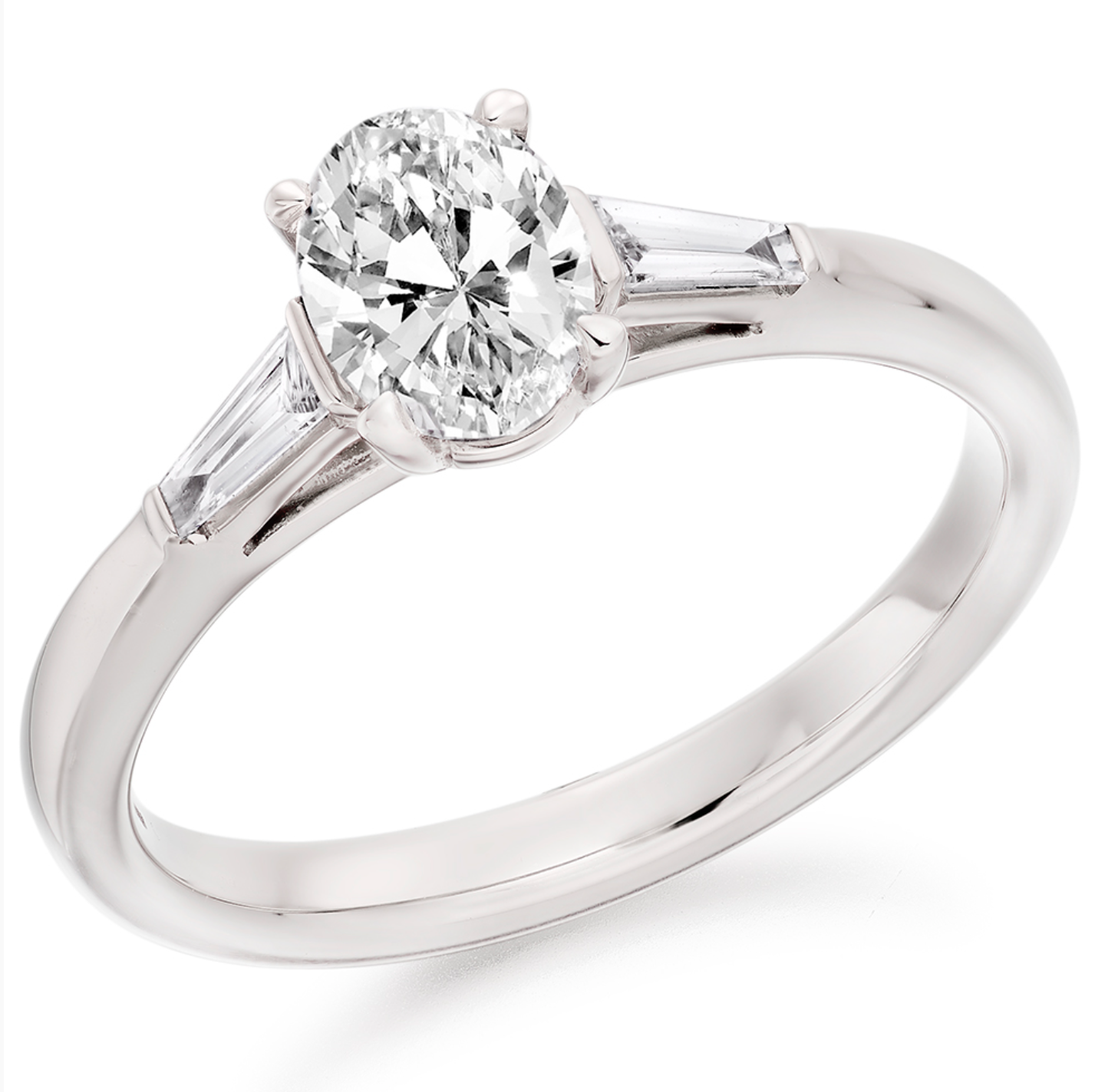 0.93ct total diamond weight Oval and Tapered Baguette cut trilogy engagement ring with plain shoulders. The setting is claw set and bar set.
