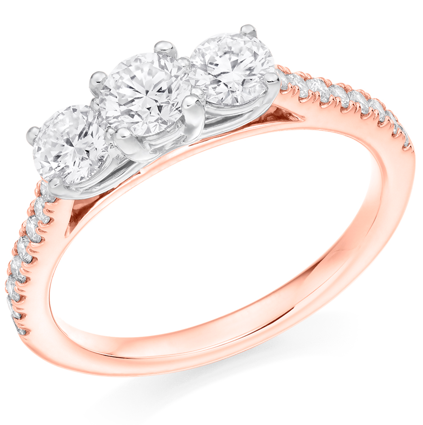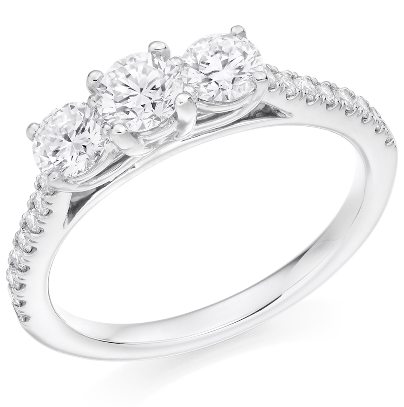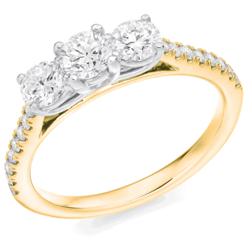 1.03ct total diamond weight Round Brilliant cut trilogy engagement ring with diamond set shoulders. The setting is grain set and claw set.