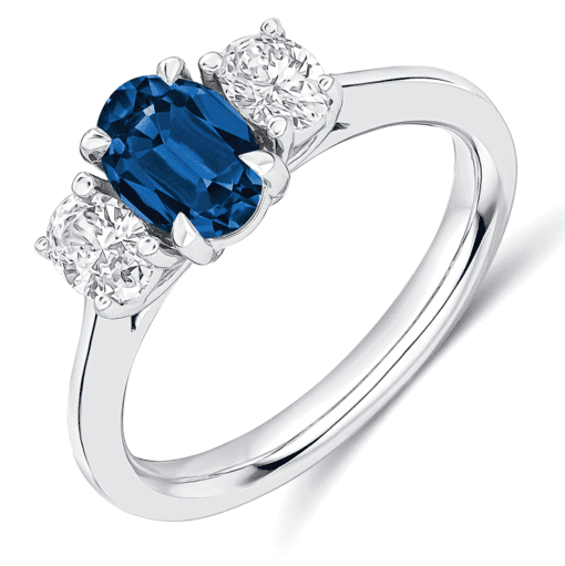 1.30ct total carat weight Oval cut Sapphire and Diamond trilogy engagement ring with plain shoulders. The setting is claw set.