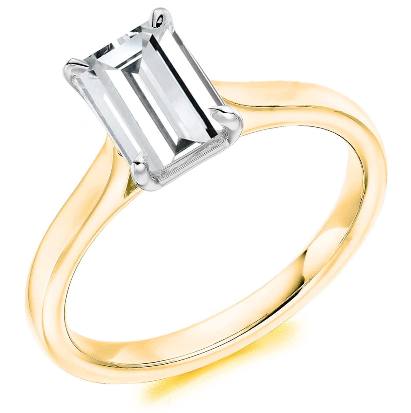 1.50ct Emerald cut solitaire single stone engagement ring with plain shoulders. The setting is a 4-claw setting.