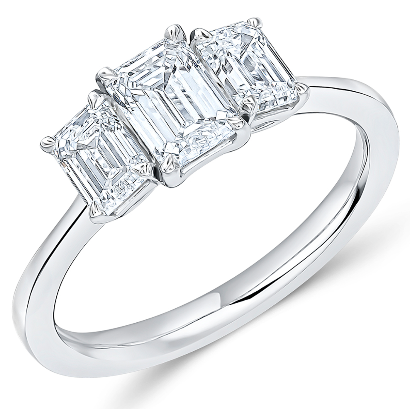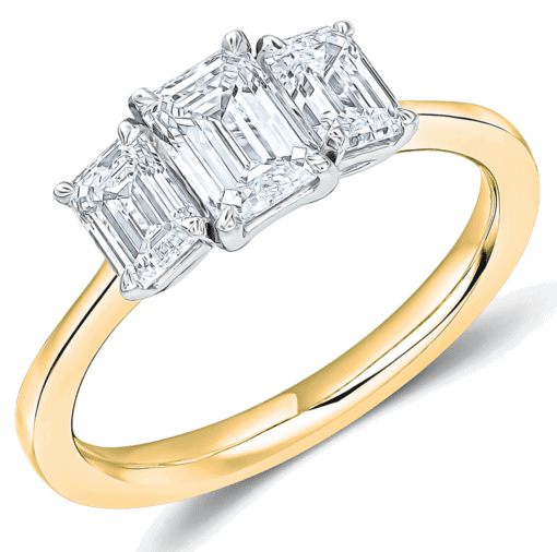 1.50ct total diamond weight Emerald cut trilogy engagement ring with plain shoulders. The setting is claw set.
