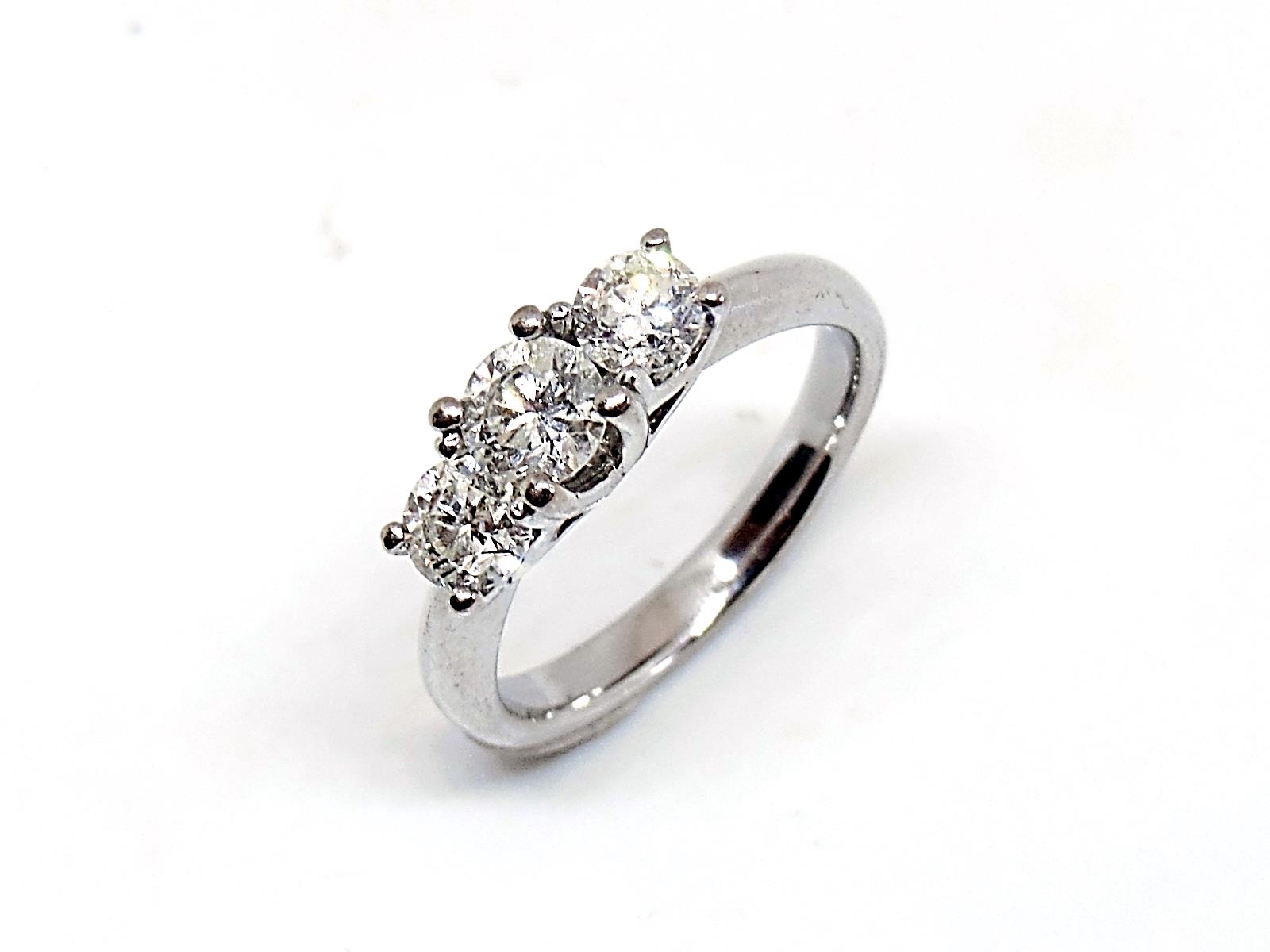 18ct white gold three stone claw set diamond ring, total diamond weight 1ct.