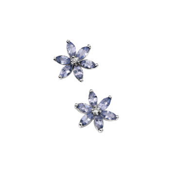 9ct white gold tanzanite and diamond flower stud earring with post and scroll fittings.