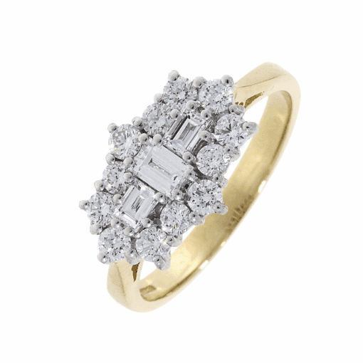 A striking diamond cluster ring featuring a combination of baguette and brilliant-cut diamonds for a total diamond weight of 0.78ct. The design includes 0.34ct of baguette-cut diamonds and 0.44ct of brilliant-cut diamonds, set in 18ct gold with a yellow gold shank and white gold head. A refined piece showcasing balance, precision, and timeless elegance.
