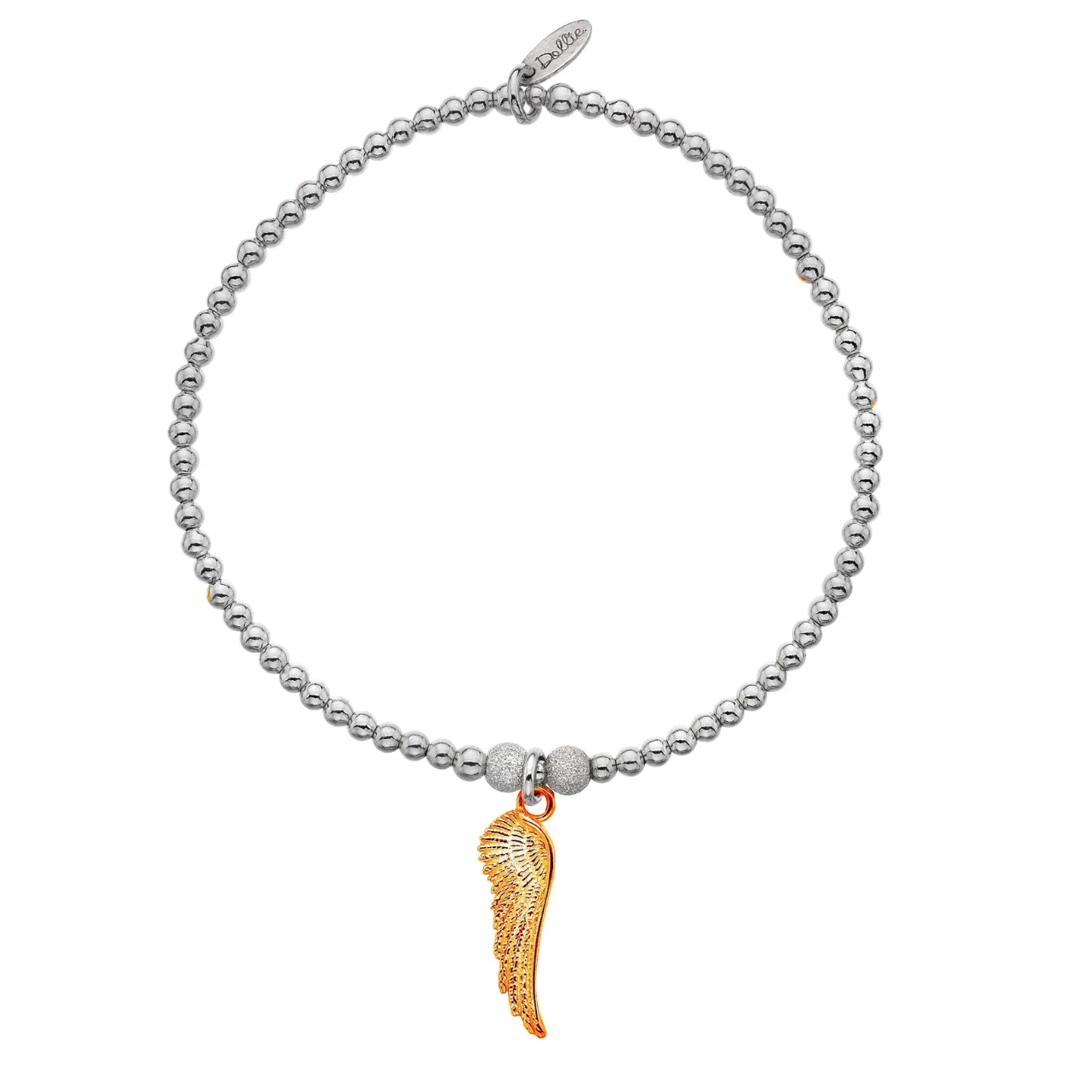 Let your dreams be your wings and have the courage to fly with this beautiful sterling silver angel wing bracelet. Handmade with 2.5mm beads and finished off with magical moon dust accents. The detailed 24ct rose gold plated angel wing charm is pretty and petite, making this bracelet the perfect gift.