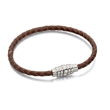 Fred Bennett narrow plaited brown leather bracelet with stainless steel magnetic clasp.