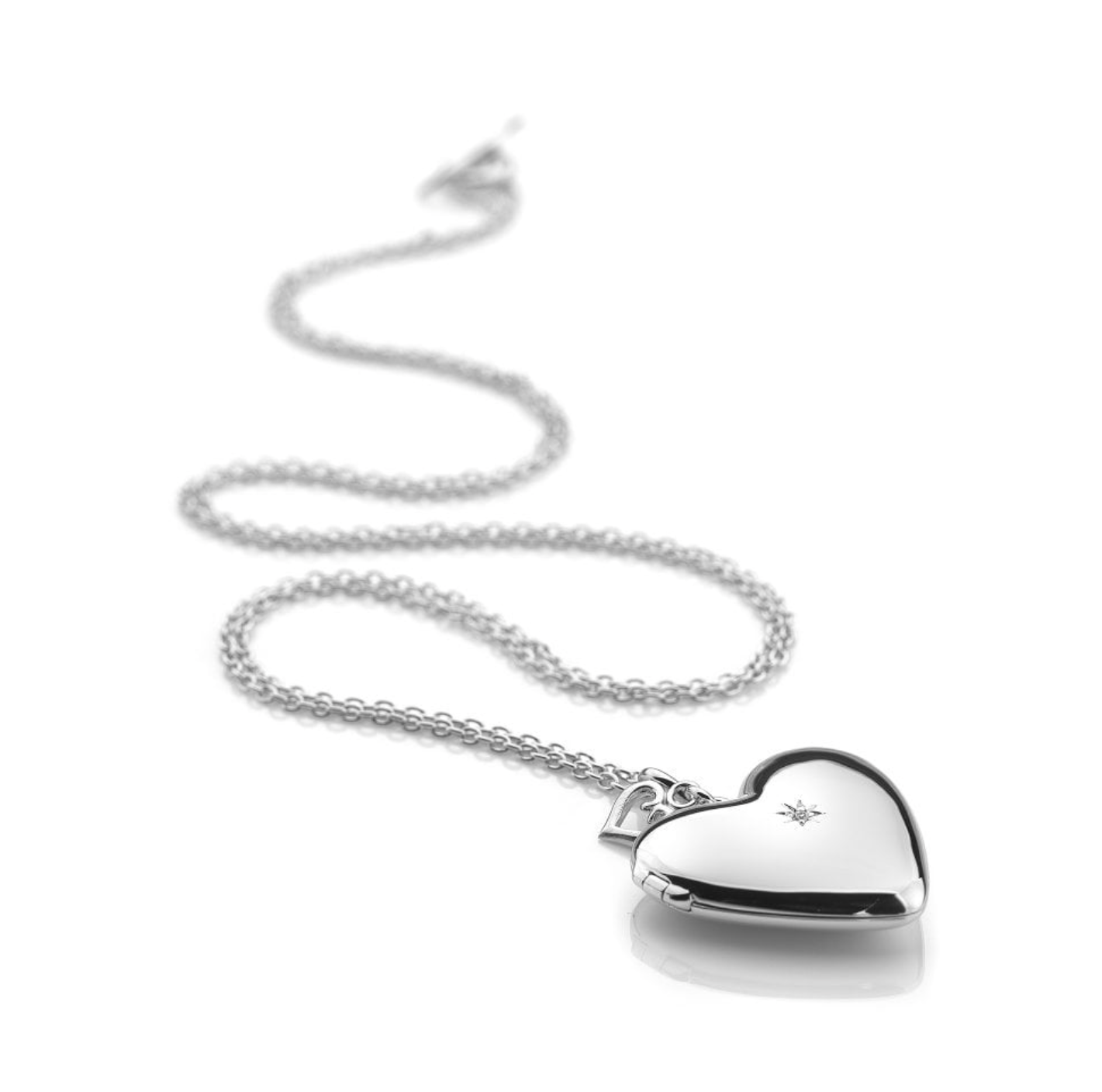 Crafted from 925 sterling silver, this heart locket measures 35mm x 28mm and is adorned with a real 2-point diamond in the centre.