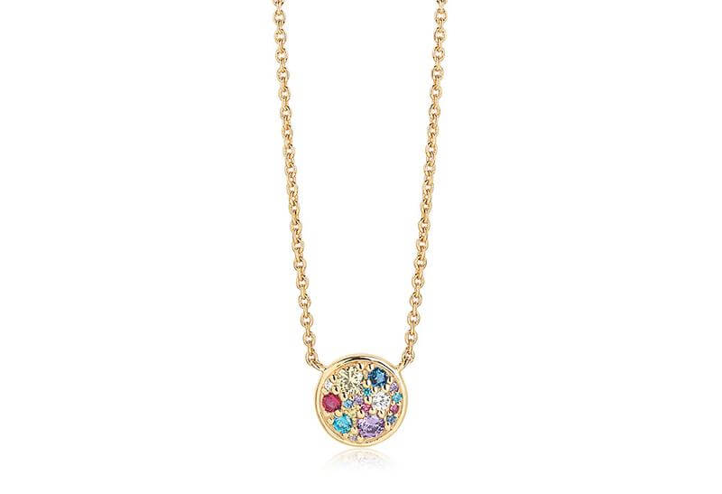 Necklace made of 18-carat gold plated 925 Sterling silver, polished surface and facet cut multicoloured zirconia. Pendant height 12mm, chain length 42cm + 5cm.