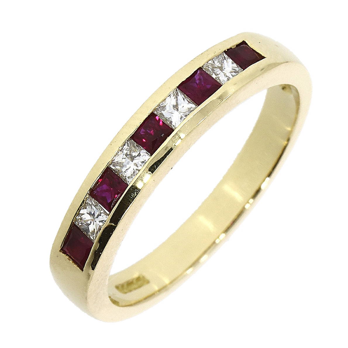 18ct yellow and white gold eternity ring, featuring five princess cut rubies and four princess cut diamonds.