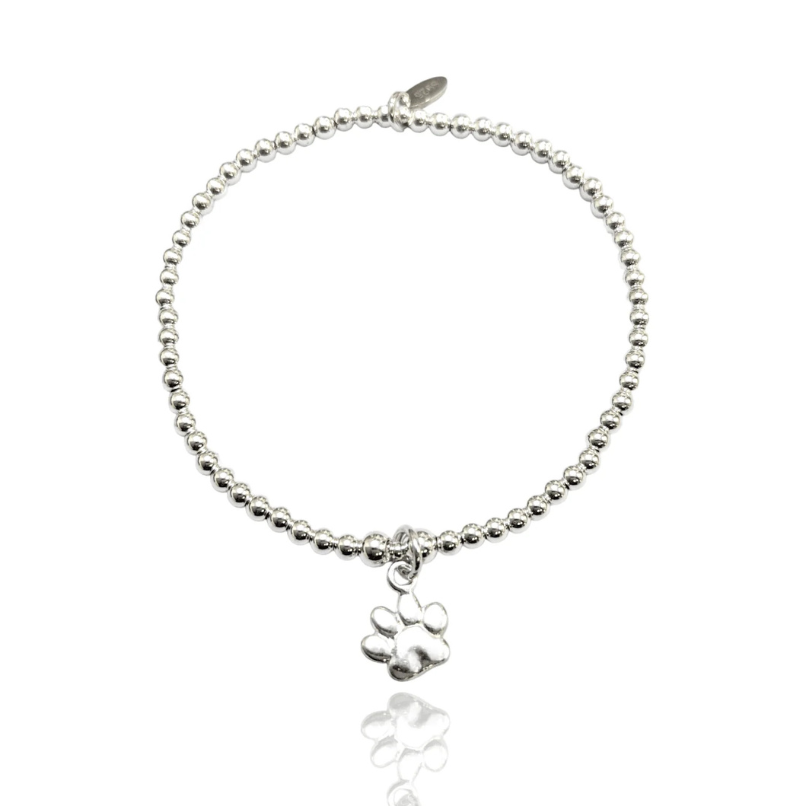 Treat yourself to this best selling Paw Print Bracelet, it's paw-some! Show your love for your beloved pet, or gift it as a thoughtful present to a fellow animal lover - either way, its timeless design will never go out of fashion. The perfect way to remember your furry friends! Beautifully crafted in sterling silver with the beads measuring at 3mm. Hand-threaded onto a super strong elastic for a universal fit. Handmade in Lincolnshire.