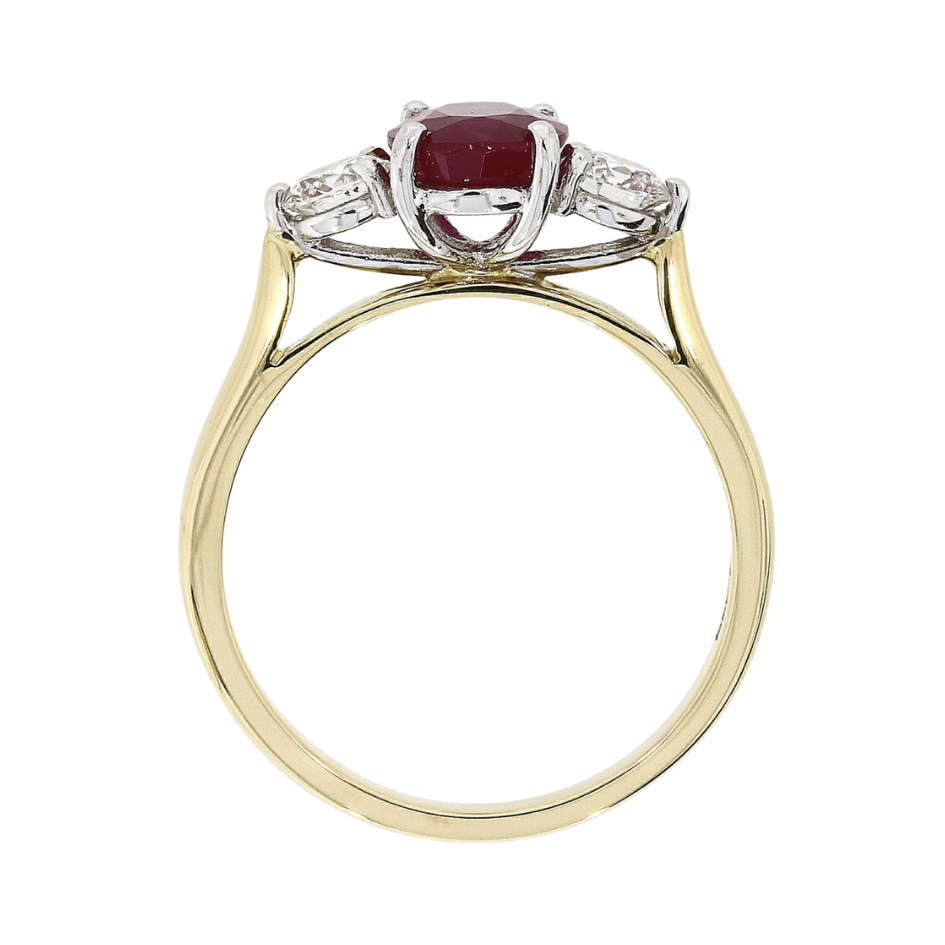A refined trinity ring featuring an oval-cut ruby (1.00ct total) accented by sparkling diamonds (0.30ct total). Crafted in 18ct gold with a yellow gold shank and white gold head, this design highlights the rich red hue of the ruby and the brilliance of the diamonds. Elegant and timeless, it is a classic addition to any collection.
