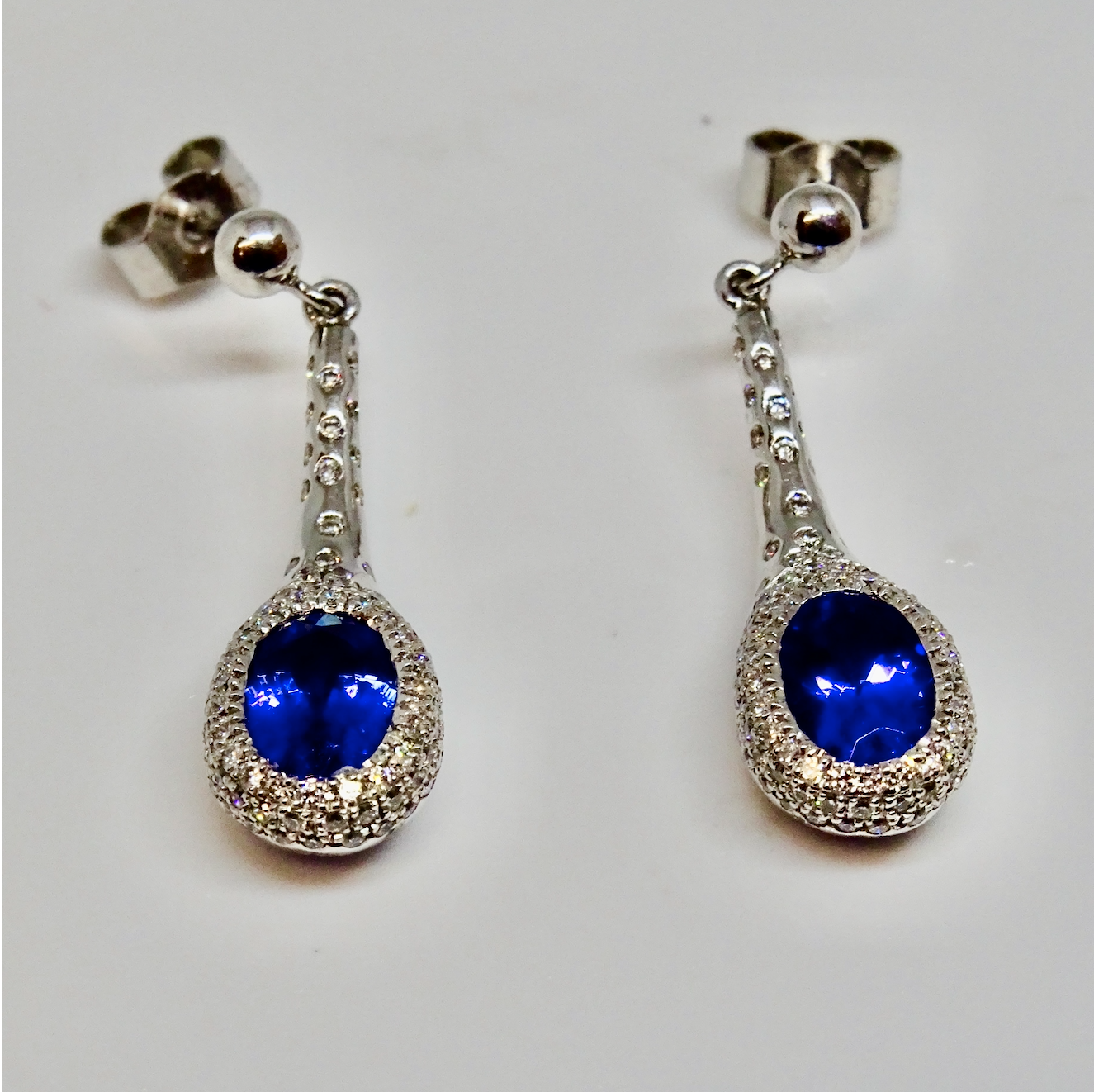 Pre-owned Vintage Tanzanite and Diamond Oval Cluster drop earrings. Set in 18ct white gold. The beautiful tanzanite blue colour is paired elegantly with sparkling white diamonds and solid 18ct white gold.